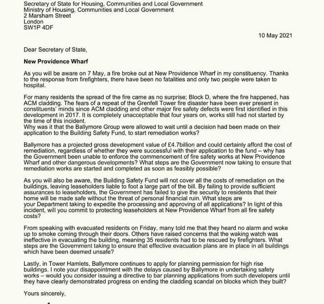 Following the fire at New Providence Wharf, I wrote to the Secretary of State for Housing. Residents need immediate protection. The government are continuing to