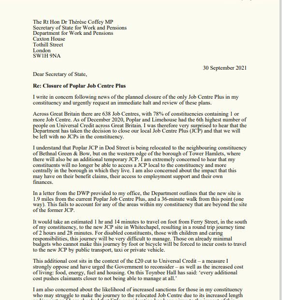 With the Universal Credit cut looming, it is shocking that the Department for Work & Pensions are planning to close Poplar Job Centre. I’ve written