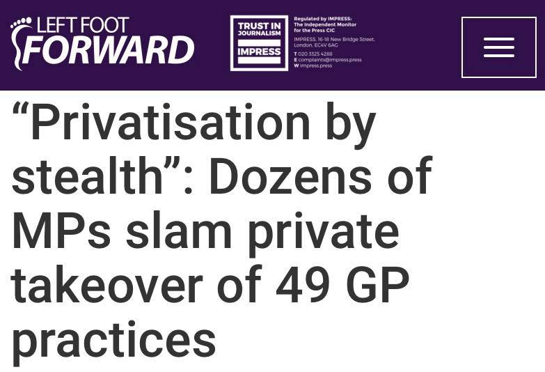 Left FootForward coverage of our ongoing campaign: “Privatisation by stealth”: Dozens of MPs slam private takeover of 49 GP practices GP practices taken over by