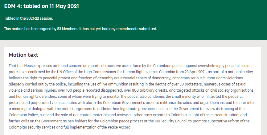 I have signed this Parliamentary motion from Tony Lloyd MP to express my concern at the situation in Colombia and the excessive use of force