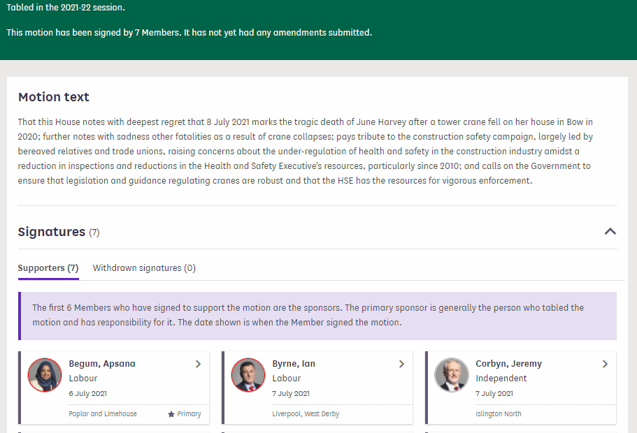 Tomorrow marks the first anniversary of a crane collapse in my constituency, which led to the tragic death of June Harvey. Today, I tabled a