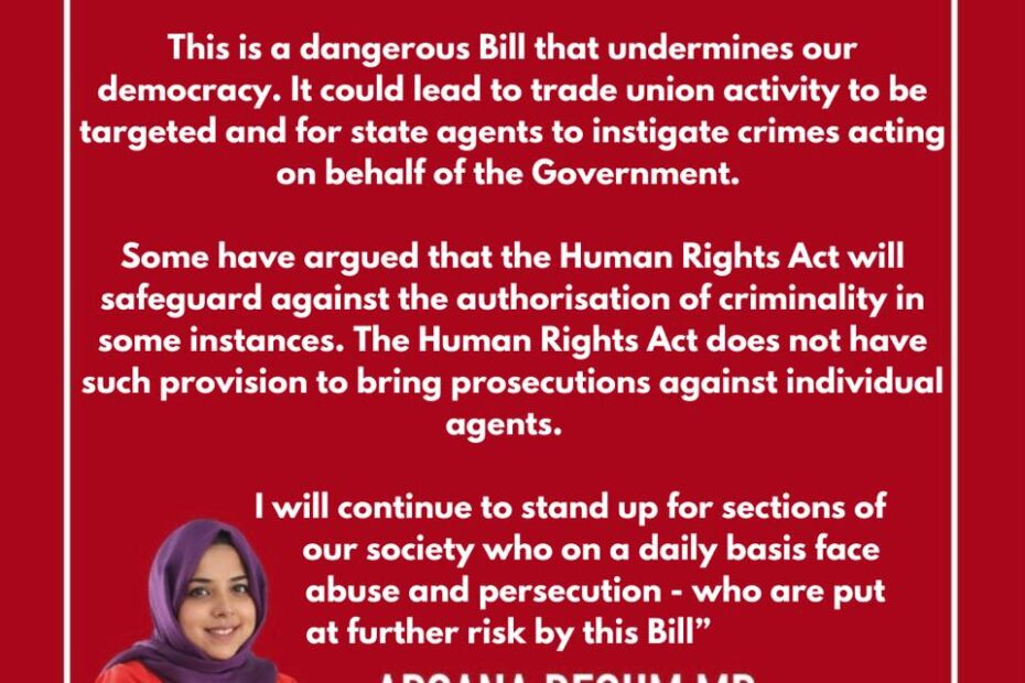 I voted against the Covert Human Intelligence Sources Bill today. This Bill is a danger to our fundamental human rights and undermines democracy.